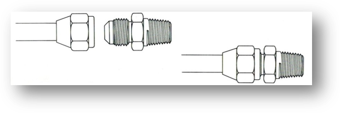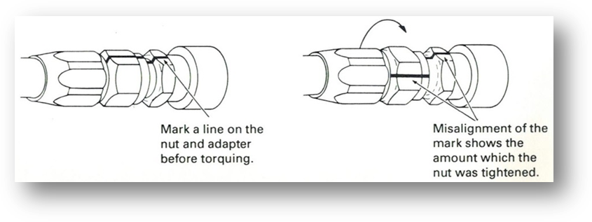 How it Works: This connection seals on the two mating 37° seats. Causes: Most of the leaks on this connection are due to lack of tightening or human error. You can’t tell if the nut has been tightened by just looking at the connection. If it is more than finger tight, you can’t tell from observation how much. Torque wrenches are good only when they are used. You must rely on the user to be sure torque wrenches are used on all joints. The user must depend on his memory to know if he has tightened all of the joints. Cure: Here are steps for an excellent method of tightening. Anyone can tell if the joint was tightened and how much.