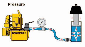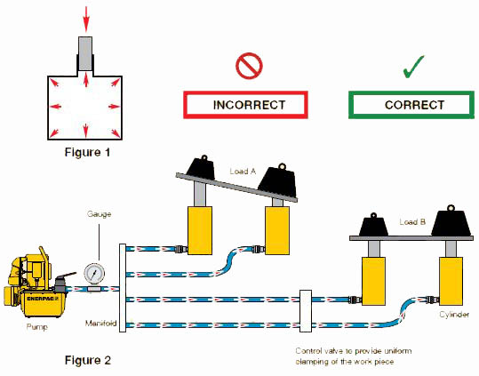 Pressure applied at any point upon a confined liquid is transmitted undiminished in all directions (Fig.1). This means that when more than one hydraulic cylinder is being used, each cylinder will pull or push at its own rate, depending on the force required to move the load at that point (Fig. 2). Cylinders with the lightest load will move first and cylinders with the heaviest load will move last (Load A), if the cylinders have the same capacity. To have all cylinders operate uniformly so that the load is being pulled or pushed at the same rate at each point, control valves (see Valve section) must be added to the system (Load B).