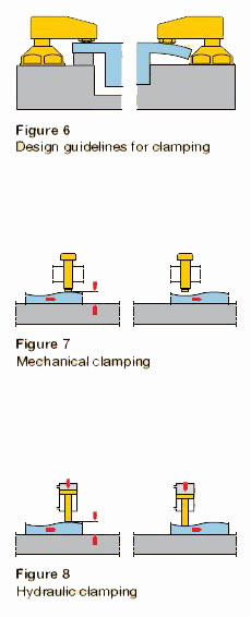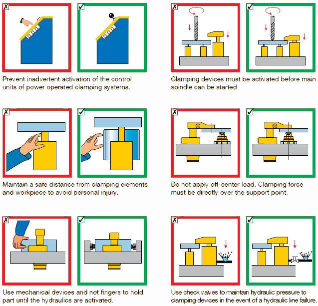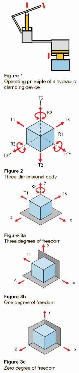 Mechanical clamping elements are usually used for simple clamping devices. However, mechanical clamping elements may be converted to hydraulic ones by inserting cylinders between the clamping element and the workpiece. In addition, mechanical elements may also be combined with hydraulic clamping elements. Clamping may be subject to errors that cause deformation of the clamped workpiece. Since such deformations must not affect the function of the workpiece, all conceivable locating and supporting techniques, as well as the best possible directed transmission of the clamping force through the workpiece, should be considered. It is recommended that clamping forces be estimated to prevent excessively high clamping forces and possible deformation of the workpiece. Deformation of the workpiece may also be avoided by selecting a suitable shape (for example, a sphere) for the clamping points and the locating points.