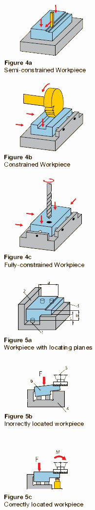 2.1.1 Locating a Body - The term “locating” refers to the process of positioning the workpiece inside the clamping device, and holding it in position for the necessary machining. Only workpieces that are correctly held can be consistently machined within specified tolerances. 2.1.2 Limiting the degrees of freedom - The process of locating and holding a workpiece may be referred to as “limiting the degrees of freedom.” Any motion of a workpiece in any possible direction is considered to represent one degree of freedom. A three-dimensional workpiece therefore possesses six degrees of freedom, as shown in Figure 2. These six degrees of freedom consist of the translational motions “T” in x, y, and z direction, and the rotational motions “R” turning about the x, y, and z axes. The degrees of freedom that a given workpiece or body possesses may be reduced by introducing reference planes that pass through any two axes. For example, the plane in Figure 3a limits movement to travel in x and z directions and rotation about the y-axis. By defining this fixed plane, the workpiece can thus be limited or constrained to three degrees of freedom. Another two degrees of freedom may be constrained by introducing a second reference plane, as shown in Figure 3b. This reference plane limits movement to translational motion in the x direction. Constraining the last degree of freedom can be accomplished by defining a third reference plane as shown in Figure 3c. 2.1.3 Locating a workpiece - The process of locating and holding a necessarily require the elimination of movement in all six degrees of freedom, the following three locating techniques are used in actual practice. Figure 4a: Semi-constrained Workpiece. The workpiece is held in one plane only (elimination of three degrees of freedom). Figure 4b: Constrained Workpiece. The workpiece is held by two planes (elimination of five degrees of freedom). Figure 4c: Fully-constrained Workpiece. The workpiece is held by three planes (elimination of six degrees of freedom).