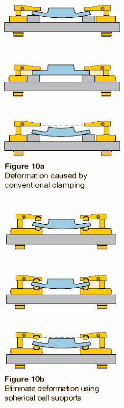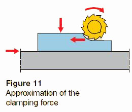 A workpiece is considered to be supported even if it must be supported by frequently mobile and variable elements surpassing the theoretical maximum number of locating points. An example of this would be an unstable workpiece that easily vibrates. When a deformed workpiece must be held and clamped in all three planes without altering its shape, it is possible to use a technique involving self adjusting spherical surfaces. In this case the bearing surfaces, the close tolerance bolts, the limit stops, and the vertically adjustable supporting and clamping elements must be equipped with spherical surfaces. The illustrations in Figure 10 illustrate two different clamping methods. It shows deformation of a workpiece caused by conventional clamping (Figure 10a). As a result of this deformation, the surface area of the workpiece exhibits a greater degree of deformation when unclamped. This deformation, which is convex in shape, may be attributed to the fact that the workpiece assumes its original, deformed shape (c), as soon as the clamping pressure is released. The clamping points illustrated in Figure 10b are spherically shaped, and can therefore largely adapt to the workpiece curvatures (b). The machined surface is therefore flat, and the workpiece is only exposed to possible internal stresses that may be released by machining. 4.3 Determination of the clamping force - It is important to ensure that a workpiece that is clamped inside a device is not moved from its position by the clamping force and the subsequent action of the cutting force. This risk of movement may be minimized by applying the clamping force to the solid bearing surfaces of the device (Figure 11).