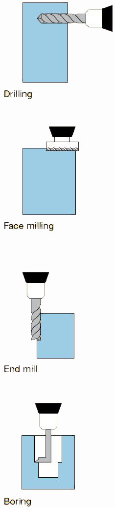 This introduction will help you use information provided by tool manufacturers in the application of their tools. Estimating cutting forces being transferred into the workpiece is just one tool to use in a competitive workholding environment. The information presented here is only to be a guideline and not the final decision. Use this information with a cutting tool brochure you get from your cutting tool supplier as an aid in determining your cutting forces. Much of the calculations presented here are readily available from many sources. Your cutting supplier may even have a slide chart you can obtain to do equations for you. The operations described here include boring, drilling, end milling and face milling. Drilling involves using a multi-fluted tool with a helix spiral. The tool is driven in as it is rotated to create a round hole. End Milling uses a multi-fluted rotary tool with or without removable (inserts) teeth to remove material along the edge of the workpiece. The cut is usually very shallow and the depth is many times the thickness of the cut. Face Milling involves a very shallow depth, but a very wide cut. Cutters can range up 12 inches (300 mm) or more in diameter and can have many replaceable teeth (inserts). These examples are only a very small sample of operations that can use hydraulic workholding.
