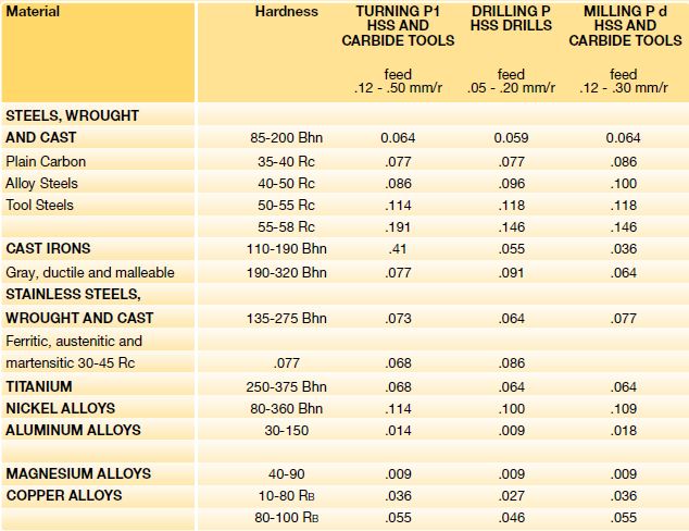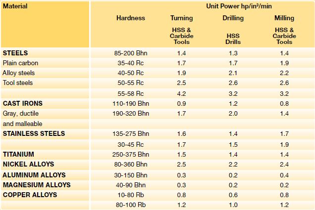 Metric System Cutting Force (Newtons) = Spindle Power (kW) x 48000 (80% efficiency) / Cutting Speed (Meters per minute). Spindle Power = Unit Power (kilowatts per cubic centimeters of material remove per minute) x Material removal rate (cubic centimeters per minute). Material removal rate (Cubic centimeters per minute) = Width of cut (mm) x depth of cut (mm) x feed per tooth (mm) x number of teeth x spindle RPM/1000. Example: A 200 mm cutter with 10 teeth is machining low silicon aluminum at 1000 MPM (meters per minute). Solving Tool RPM = MPM x 1000 Diameter (mm) x p (= 1592 Tool RPM) The same tool catalog lists a feed per tooth of 0.2 mm at 1000 MPM and a cutting depth of 2.5 mm. This gives an 200 mm cutter x 2.5 mm depth x 0.2 mm feed x 10 teeth x 1592 Tool RPM/1000 = 1592 cm3/min. Spindle power = 1592 x 0.018 = 28.7 kW This too is power from a fixture design standpoint; the actual operation will use less power than indicated here. Using the original formula transposed is: Cutting Force 1378 (Newtons) = 28.7 (kW) x 48000 (80% efficiency) / 1000 (MPM cutting speed). Multiply by a safety factor of 2 for rigid clamping and by 1.5 for elastic clamping (hydraulic). This calculation does not take into account coefficients of friction when using clamp cylinders. For example, if the aluminum has a coefficient of .12 (flooded with coolant), the clamping force becomes 1378/.12 = 11483 Newtons of force. This calculation does not take into account forces being generated by the fixture positioning cylinders. Use these numbers and set up your hydraulic system to run at about 50 to 75% of its rated pressure. This leaves some reserve for a later date when the process is optimized and you need more holding/ clamp force for higher speeds and feeds. If you design to the maximum now, you have nothing in reserve. Unit Power for Dull Tools (Imperial System)