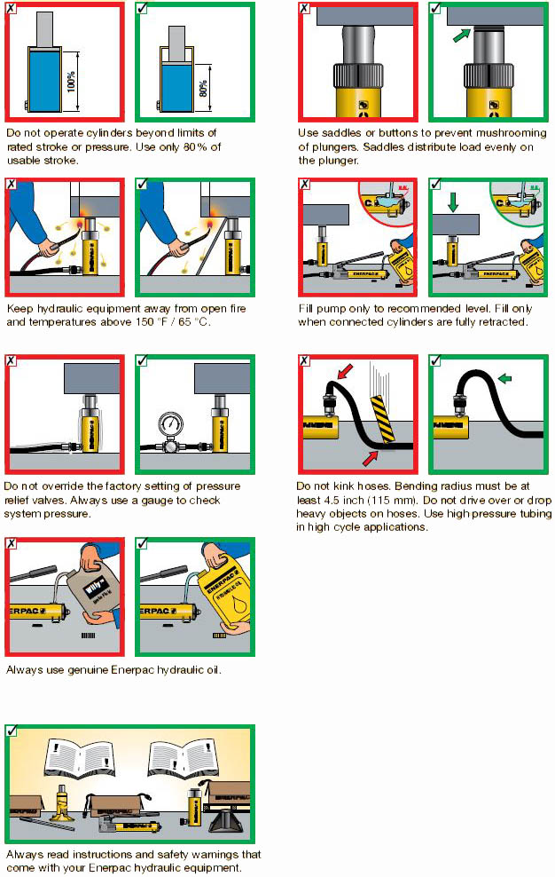 Hydraulic clamping can increase your machine shop’s efficiency by reducing setup time. Power clamping can also maximize output by reducing employee lost time due to the injuries that can occur with manual clamping. Although hydraulic operation moves the control of the clamping fixture to an area of greater safety, operators must still be alert to several common sense practices. And to that end we offer some DOs and DON’Ts, simple common sense points which apply to all Enerpac hydraulic products. The line drawings and application photos of Enerpac products throughout this catalog are used to portray how some of our customers have used hydraulics in industry. In designing similar systems, care must be taken to select the proper components that provide safe operation and fit your needs. Check to see if all safety measures have been taken to avoid the risk of injury and property damage from your application or system. Enerpac cannot be held responsible for damage or injury, caused by unsafe use, maintenance or application of its products. Please contact the Enerpac office or a representative for guidance when you are in doubt as to the proper safety precautions to be taken in designing and setting up your particular system. In addition to these tips, every Enerpac product comes with instructions spelling out specific safety information. Please read them carefully.