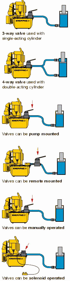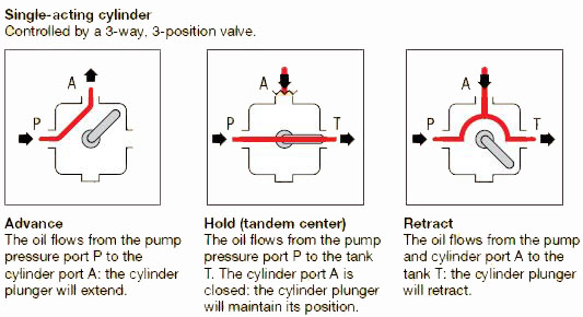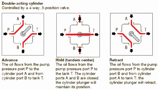 Directional control valves Ways – the (oil) ports on a valve. A 3-way valve has 3 ports: pressure (P), tank (T), and cylinder (A).A 4-way valve has 4 ports: pressure (P), tank (T), advance (A) and retract (B). Single-acting cylinders require at least a 3-way valve, and can, under certain instances, be operated with a 4-way valve. Double-acting cylinders require a 4-way valve, providing control of the flow to each cylinder port. Positions – the number of control points a valve can provide A 2-position valve has the ability to control only the advance or retraction of the cylinder. To be able to control the cylinder with a hold position, the valve requires a third position. Operation – the way to shift the valve into position. The valve position can be manually operated with the use of the handle. The valve position can be solenoid operated using power supply. Center configuration The center position of a valve is the position at which there is no movement required of the hydraulic component, whether a tool or cylinder. The most common is the Tandem Center. This configuration provides for no movement of the cylinder and the unloading of the pump. This provides for minimum heat build-up. The next most common is the Closed Center configuration, which is used mostly for independent control of multi-cylinder applications. This configuration again provides for no movement of the cylinder, but also dead-heads the pump, isolating it from the circuit. The use of this type of valve requires some means of unloading the pump to prevent heat build-up. Another commonly used valve configuration is Float Center. This type of valve allows the cylinder ports to drain pressure back to tank. Used with a pallet mounted pilot operated check, it allows the hydraulics to be disconnected from the pallet.