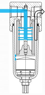 The purpose of a coalescing filter is to provide a very fine degree of filtration, removing moisture, oil, and particulate matter as small as .01 micron. The air flows from the inside to the outside of the element through progressively larger media. As contamination moves through the element, solid particles are trapped and liquids are formed into large droplets. As the air exits the element surface, tension holds the liquids and allows them to drain to the bottom of the bowl.