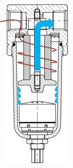 The purpose of a particulate filter is to remove moisture and contaminants from compressed air. The air entering the filter is passed through a whirl disc that creates high centrifugal force with minimal pressure drop. The whirling action forces liquids and solids against the inside of the bowl where gravity pulls them to the quiet zone below the baffle where they can be drained out. The air then flows through the element where smaller particles are removed and the dry, filtered air passes downstream.