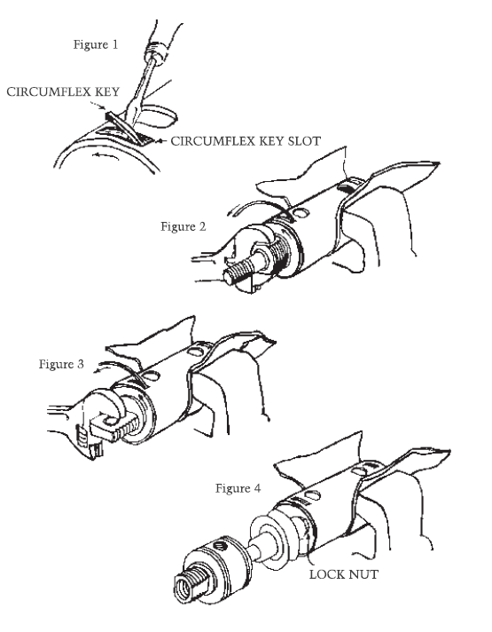 Remove any plumbing from cylinder ports; wrap brrel in heavy cloth to prevent damage to barrel. Place cap end of cylinder barrel in vise. As you rotate head counter clockwise, use a screw driver to lift end of circumflex key clear of slot (figure 1 below).