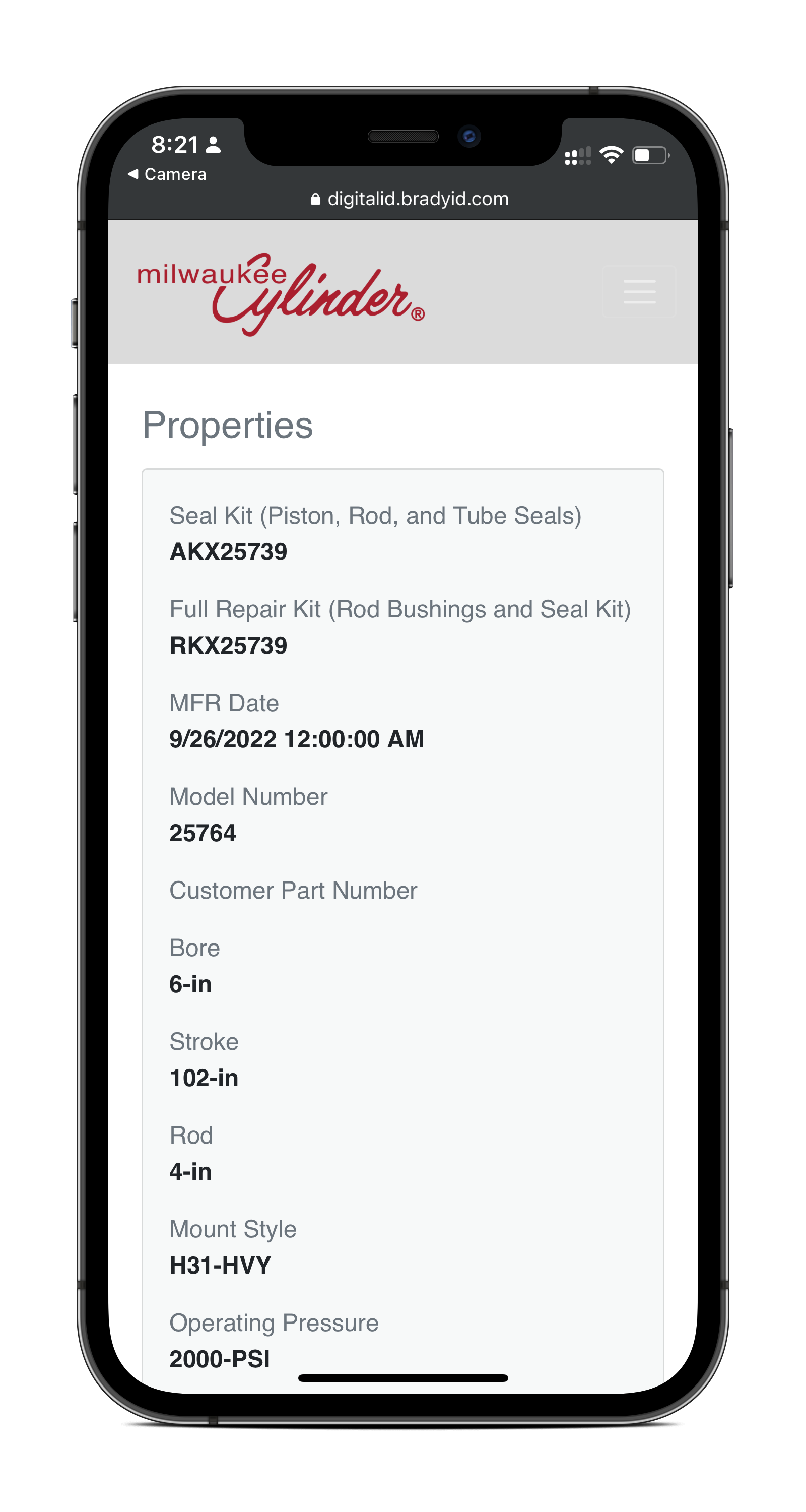 Milwauke Cylinder's provide an EST (Electronic Service TagTM) on every H-Series, MH-Series, LH-Series and A-series cylinder that gives you access to every piece of information your maintenance team will need to service or replace your cylinder.